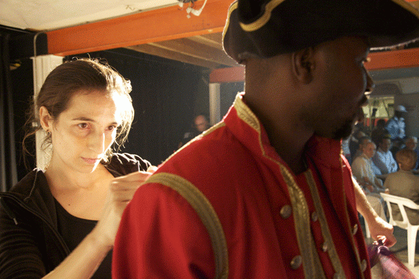los figurantes africanos nos cuentan historias pero en silencio (porque son los figurantes y se sigue oyendo -siempre de fondo, como un bajo machacón- la escena de ibsen). por eso nos cuentan las historias por escrito, a través de un ordenador. escriben historias: accidentes en la construcción (amigos que han perdido), colegas que se han quedado en paro, maneras de encofrar, sistemas de construcción…